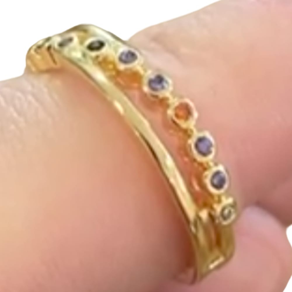 O Anel Tulipa é uma joia marcante, perfeita para quem busca sofisticação com um toque de cor. Seu aro é adornado por zircônias roxas delicadas, dispostas em pequenos círculos que se intercalam com o metal banhado a ouro 18k. O contraste entre o dourado e o tom vibrante das pedras cria um visual elegante e contemporâneo, ideal para eventos especiais ou para elevar o look do dia a dia.