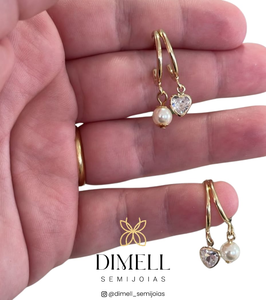 Na outra, um charmoso coração vazado, contornado por banho de ouro 18k, abriga um cristal brilhante no centro, criando um ponto de luz encantador.