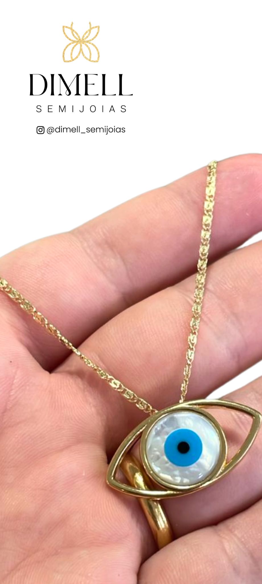 Pingente moderno e simbólico: O pingente traz o formato estilizado de um olho com estrutura geométrica dourada, e no centro, uma madrepérola reluzente que valoriza o clássico olho azul com acabamento esmaltado.