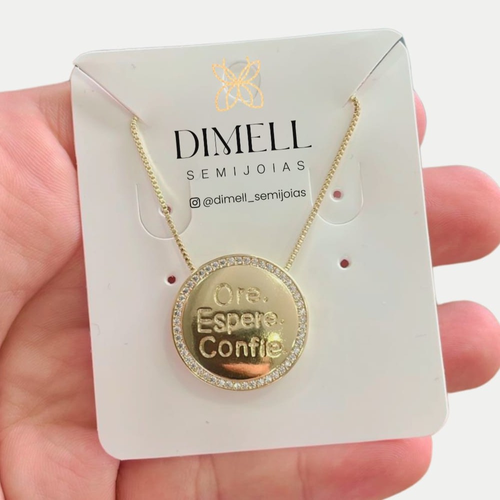 Design: pingente em formato de medalhão pequeno, com a frase “Ore, Espere, Confie” gravada em relevo. Um símbolo de fé e serenidade, em uma peça discreta e elegante.